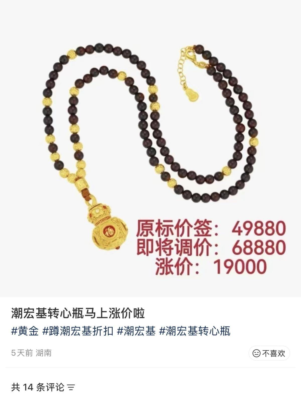 记者注意到,昵称“潮宏基打工人”的网友发布了多款产品的涨价信息,称1月15日起品牌将对部分产品调价,潮宏基旗下爆款“转心瓶”项链从49880元涨至68880元,涨幅高达19000元。