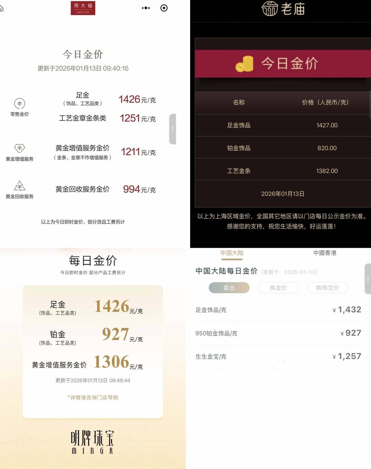 部分品牌金饰1月13日金价。